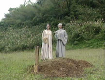 | 夜晚,周世顯獨自一人來到長平的假墳前,和每次一樣,不停地向四處環視,等候著、找尋著長平的身影,卻絲毫沒有料到長平此時趁著夜色,正悄悄地躲在草叢裡窺視著自己。一陣查找之後,什麼也沒有發現,頓時,失望至極:「又沒有來。」他只好自言自語地慨歎。 |