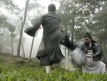 | 突然,智慧運氣凌空躍起,一個翻滾,施展出絕技「大雁神功」!只逼得岱岩後退數步,仰面摔倒在地;見無法招架,岱岩趕忙落荒而逃。 |